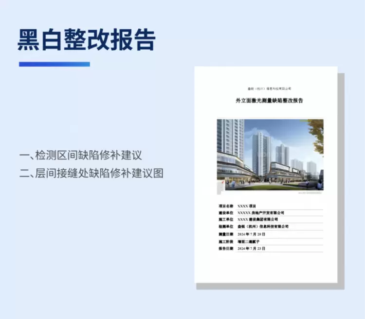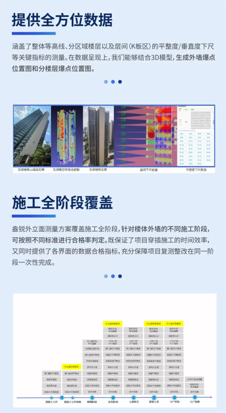 盎锐外立面测量方案对外立面施工过程及结果呈现进行质量监控及督促整改,更加贴合现今市场及业主需求,切实有效解决了施工过程难度大、成本高、效率低的问题,进而实现了外立面整体质量观感的有效管控和提升,帮助项目实现降本提效,助力高品质交付。