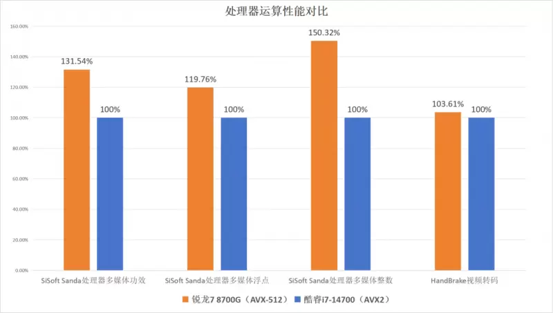 ▲锐龙7 8700G内置AVX-512指令集,它的多媒体运算性能大幅领先酷睿i7-14700。