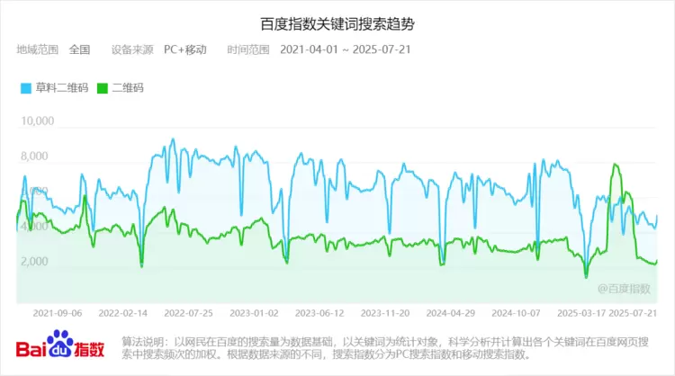 搜索数据也印证了草料在二维码工具市场的领先地位。百度指数显示,自2021年的4月份起,“草料二维码”的搜索热度长期高于通用关键词“二维码”。在最近一个月的数据统计中,“草料二维码”日均搜索量为4436次,是“二维码”日均搜索量(2258次)的1.96倍,表明用户在二维码相关需求中,越来越倾向于主动搜索草料二维码这一品牌词。