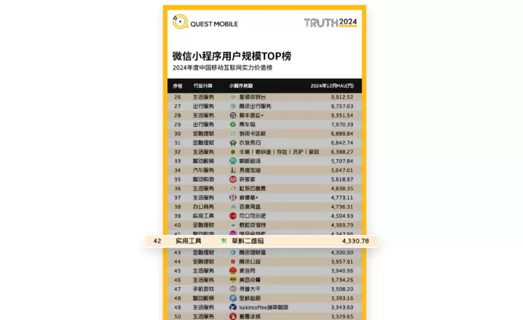 近日,数据机构 QuestMobile 发布的《2024年度中国移动互联网实力价值榜》,在“微信小程序用户规模TOP榜”中,草料二维码凭借4330万月活跃用户,排名第42位,与肯德基、腾讯理财通等产品排名相近。作为一款面向企业、机构与组织的工具型产品,草料二维码是榜单中为数不多的B端应用。
