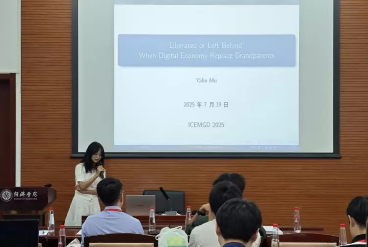 来自加拿大多伦多大学的穆亚琳汇报了“数字经济与隔代照料”为题目的经济学研究。本研究主要研究数字经济发展如何减少老年人的隔代照料频率,使用了双重差分方法进行了实证研究,从多个角度研究数字经济如何增加或减少隔代照料的比例。研究分性别、年龄、子女数量等人口统计学指标进行了分样本分析,并从供、需两方面,讨论了这一效应背后的相关机制。
