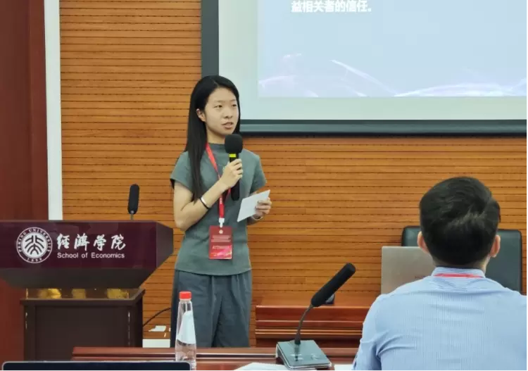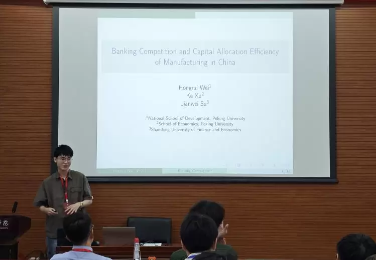来自北京大学的韦闳瑞汇报了“Banking Competition and Capital Allocation Efficiency of Manufacturing in China”为题目的经济学研究。本研究首先建立了企业的最优化过程,并构建了银行和银行之间的博弈过程,构建了银行的筛选努力和竞争随银行数量变化的理论假设。本研究使用银行集聚性HHI衡量银行间竞争,使用固定效应模型实证验证了银行竞争对资本配置效率的影响。