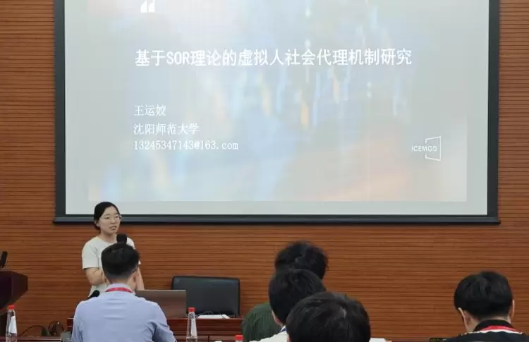 来自沈阳师范大学的王运姣汇报了“基于SOR理论的虚拟人社会代理机制研究”为题目的研究。本研究主要研究消费心理变化如何在虚拟人在直播场景中的社会代理行为的影响,使用PLM方法进行了实证检验,并分情感代理、行为代理、社交代理和决策代理四个方面进行了机制分析,讨论了数字人的未来发展。
