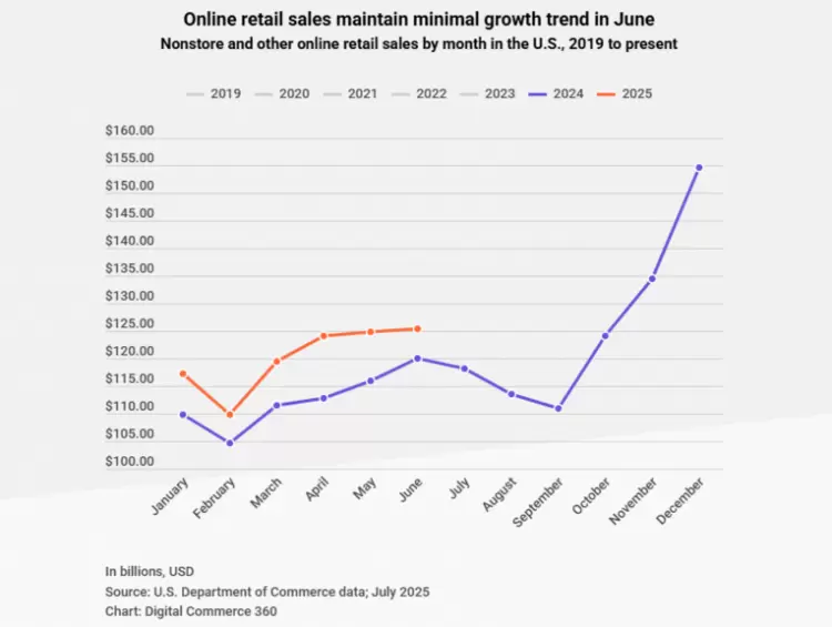 2025年已过半,各位卖家今年生意如何?根据第一季度财报显示,各大跨境电商平台营收增速呈放缓趋势,曾经突飞猛进的跨境电商已然进入沉淀期。加之,年初特朗普关税政策波动,大多数卖家都背负了前所未有的风险,不断调整企业的战略布局、谨慎前行,在挣扎中寻求稳定发展。根据美国商务部2025年7月份的最新数据显示,6月份美国在线零售额达到1253.1亿美元,较2025年5月的1248亿美元增长0.41% ,比2024 年 6 月的 1199.6 亿美元在线零售额增长了 4.46%。