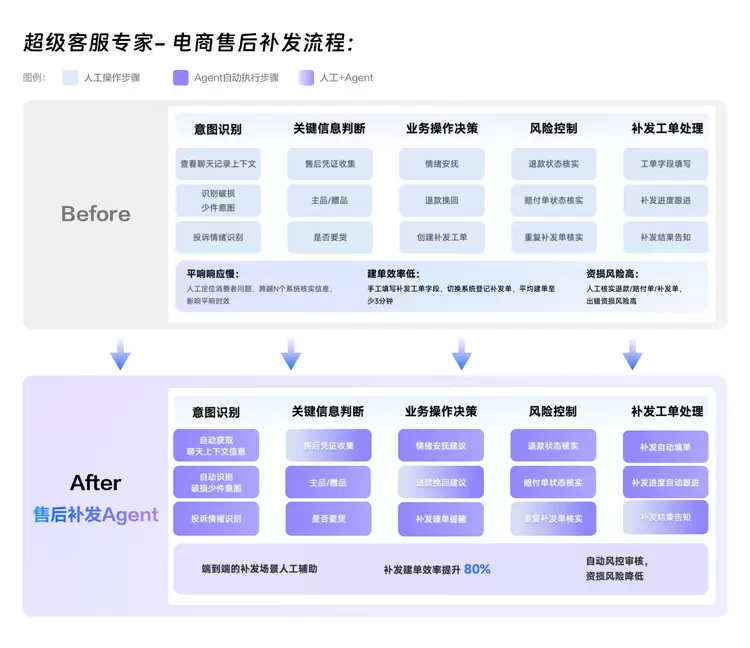 以电商平台的客服为例,当消费者申请退换货时,以往客服人员通常需要手动处理多项繁琐任务。具体而言,客服需在工单系统中输入订单详情、客户需求及地址等信息,并与物流等部门协调。这一过程涉及至少十个步骤,耗时约五分钟,且客服需频繁切换多个系统来创建补发单。这些工作看似简单重复,但极易出错,仅填写工单这一项任务就占据了客服每日工作量的一半。