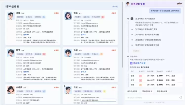 销售任务规划Agent、线索清洗Agent、销售策略Agent和到店邀约Agent正是为了解决汽车销售的全流程痛点而生的,这四个Agent可以根据业务目标为销售进行初步的线索筛选,检索出销售应该优先处理跟进的线索,并且根据销售的需求,进行AI电话外呼或根据用户画像推荐销售话术,自动打给消费者邀约试驾和沟通购车意向,等消费者试驾完成后,试驾报告Agent会再进行电话回访,并且生成消费者的试驾报告,提供销售评估后续的销售策略。可缩短线索处理时间50%,基于客户深度分析提升转化率约20%。