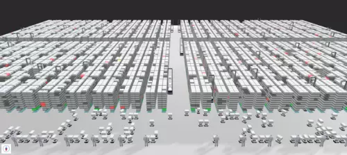 针对中型物料,我们推出了SkyCube上存下拣解决方案,“上存”是通过四向车立库搭配智能高速提升机负责整托物料的自动出入库,“下拣”指在立库区一层,由拣选机器人负责整托、单箱物料的搬运和智能拣选。以吉利西安RDC零部件成品仓项目为例,针对库容紧张、人工成本高及供料时效严苛等痛点,该方案在5000平方米立库内设置7500余个库位,完成1500种零部件精细化管理,使出库效率提升60%,准确率超99%。