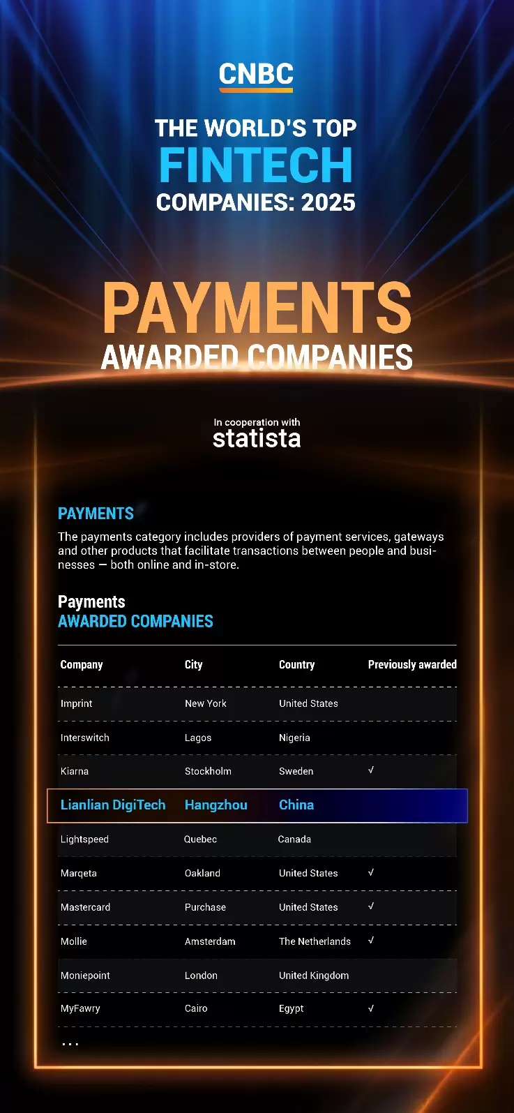7月16日,由国际知名财经媒体CNBC携手独立市场研究机构 Statista 评选的“2025年全球顶尖金融科技公司”榜单正式揭晓。连连数字凭借在全球数字支付及金融科技领域的持续创新与卓越表现成功入选,彰显其强大的技术实力与国际市场的高度认可。