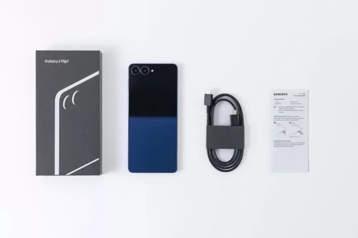 三星Galaxy Z Flip7的外包装盒,设计十分精巧,封面采用了该机的标志性元素,整体风格简约且不失高级感。打开包装盒,里面包含三星Galaxy Z Flip7手机、USB-C 数据线以及一份快速上手指南。