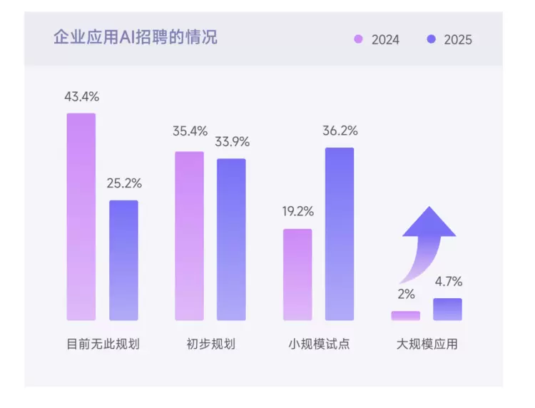 报告显示,过去一年,AI 在企业招聘中的应用呈现 “全行业渗透、规模化提速” 的特点,无AI招聘相关规划的企业从 2024 年的 43.4% 降至2025年的 25.2%。