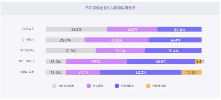 从企业规模与性质看,5000 人以上大型企业大规模应用率达 13.1%;外资合资企业与民营企业应用积极性更高,大规模应用率分别为 9.5% 和 4.6%,显著高于国有企业。