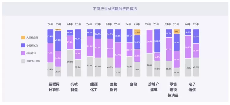 从行业来看,互联网计算机、金融、零售连锁快消品行业的AI应用程度较高,再对比 2024 与 2025 年各行业 AI 招聘应用阶段数据,部分行业可见显著变化:互联网/计算机行业AI应用的主力军由 2024 年的初步规划转向 2025 年的小规模试点,大规模应用也实现了从无到有的突破;机械/制造行业小规模试点企业的占比从 11.8% 跃升至 42.9% ;金融行业中处于大规模应用阶段的企业占比最高。