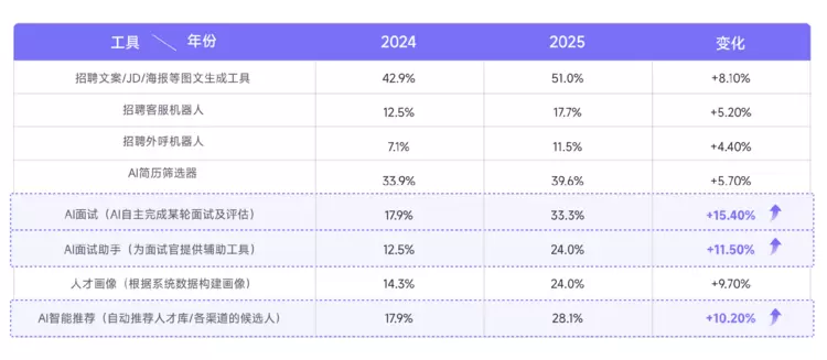 工具层面,所有 AI 工具使用率均有不同程度增长,其中 AI 面试成为增长最快的工具 —— 2025 年使用率达 33.3%,较 2024 年增长 15.4%。另一组研究表明,AI 面试综合到面率达 80%,超 86% 的候选人对其 “满意” 或 “非常满意”,“时间灵活”“无需交通成本” 是最受候选人认可的优势。此外,AI 智能推荐、人才画像工具使用率分别增长 10.2% 和 9.7%,反映出企业对 “精准匹配” 的迫切需求。