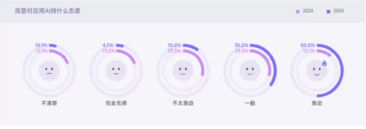 值得关注的是,企业对 AI 的投入与接纳度持续提升:2025 年 AI 招聘预算在 50 万以上的企业占比达 5.1%,较 2024 年翻倍;HR 高管对应用 AI 持“急迫”态度的占比从 2024 年的 10.1% 升至 50%,超七成企业已为员工开展 AI 培训,其中 38.3% 重点培训 3-8 年经验的 “专业能手”。