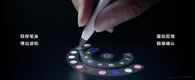 新款手写笔打造了场景化的交互方式。在天生会画App及华为笔记中,轻捏笔身快速切换笔形、色板、菜单,双击笔身,还可以在笔和橡皮擦之间切换,助力高效创作。在其他界面,轻捏弹出全局波轮,直达速记、一键摘录、全局批注、小艺圈选等功能,让各类操作一步直达。配合笔身内置微型马达带来的振动反馈,无论是轻捏、重捏,还是双击笔身,均能提供清晰的触觉提示,让交互体验更加自然生动。