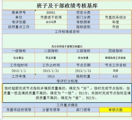 被考评单位填报指标。年初我们将市直各部门全年绩效考核工作任务指标统一录入到系统中,然后每个月各被考评单位按照节点日期完成填报工作。