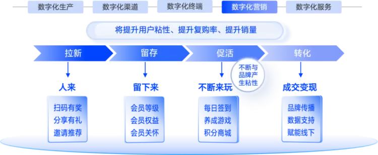 “终端触达弱、消费者粘性低,核心是企业执行力与数字化工具的缺位。”谢朝晖解释,很多企业有不错的营销策略,但缺乏触达终端的“抓手”。比如想通过促销提升复购,却因无法精准识别消费者画像,只能搞“广撒网”式营销;想追踪产品流向,却因没有全链路数据采集能力,只能依赖经销商“口头汇报”。这类问题的解法很明确:用数字化工具打通“生产-流通-终端-消费者”全链路,让策略落地有数据支撑。
