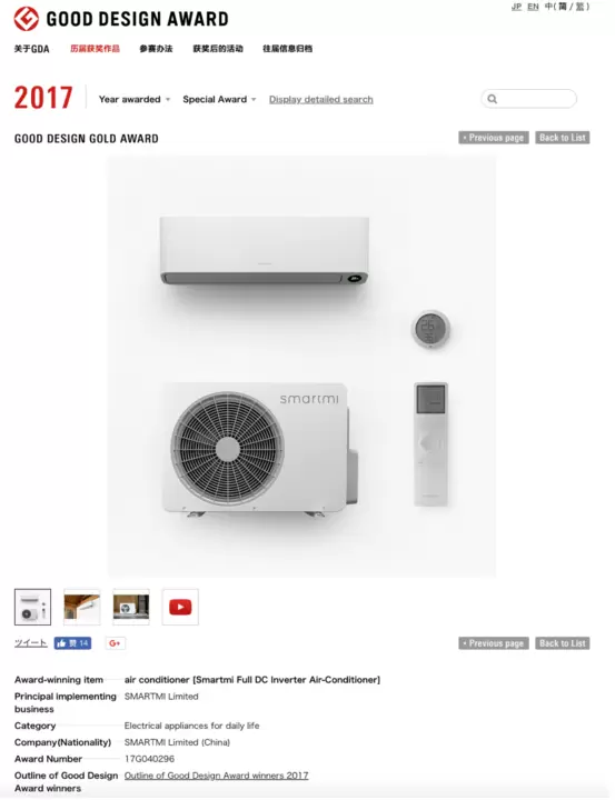 除此之外,smartmi智米首次涉足空调领域的智米全直流变频空调也在2017年斩获了G-Mark设计的金奖,这也是中国大陆首次获得该奖项的产品。G-Mark评审之一的童慧明老师讲到智米全直流变频空调在评审当天就获得了全部6位评委的全票。这款空调的每个细微间隙与角度的规整秩序之美给他们留下了深刻印象,同时演示环节中设计师的清楚流畅操作也呈现了产品性能的创新和操控的易用性,他从这款产品中感受到了智米对“用户体验”本质的思考以及品牌的追求。而评委则表示“我们将它评为金奖,就是要给日本设计界敲响警钟,让他们注意到中国设计的崛起”,智米产品的设计已经走在了国际的前沿,甚至威胁到了在家电市场中地位领先的日本品牌。