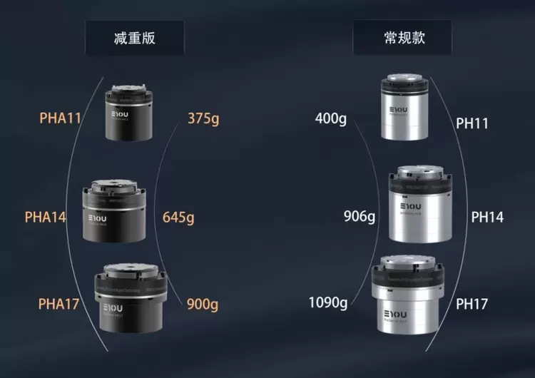 新一代产品在意优成熟的PH系列基础上,创新采用了镁合金作为结构骨架,在保证本体强度的同时,减少了30%的壳体重量。同时产品率先采用了绿的谐波轻量化减速器,同等力学性能下,进一步优化了10%的减速器重量。