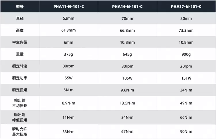 意优科技在本次大会上首发了全新一代PHA轻量化谐波关节模组,包含11\14\17三个主流尺寸型号,用于搭建高性能人形机器人。