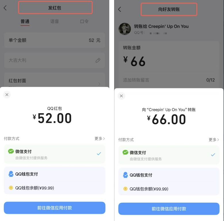 据了解,QQ和微信的支付打通远不止于此。在QQ的各类社交支付场景中,包括普通红包、语音红包、口令红包、好友转账、QQ号转账等,均已陆续支持了微信支付。