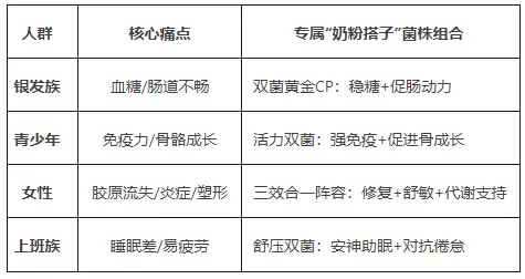 不是所有益生菌都适合所有人!我们建立了庞大的菌株数据库,针对不同人群的核心痛点,提供专属明星菌株组合: