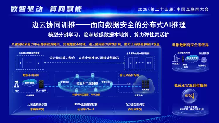 面向数据安全的分布式AI推理:面向AI时代推理用户自建AI算力成本过高、租用云端算力担心数据泄露风险的痛点需求,中国联通升级AINet网络能力,推出分布式边云协同训推方案。企业原始数据存于本地,模型中间数据存于云中心,通过智算IP广域网高效传输,实现云边算力整合与协同调度,满足AI训练/推理的算力与隐私需求。在边云协同训练场景下,企业侧部署轻量算卡,采用PP并行与云中心协同训练,样本和模型首尾层保留本地,确保数据不出园区。基于Llama2-13B实测,算效达97.7%。在边云协同推理场景下,企业侧部署轻量算卡,模型分割协同推理,通过本地处理技术保障Prompt隐私。基于DeepSeek-70B实测,算效99%,算效几乎0损失。