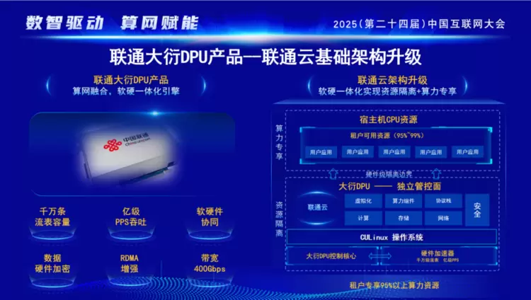 推出高性能DPU,引领云计算架构创新变革:中国联通联合合作伙伴打造“联通大衍”DPU,具备千万条流表容量和亿级PPS吞吐等行业顶尖能力,同时具备软硬件协同、数据硬件加密、RDMA增强等先进功能,助力联通云实现软硬一体化架构升级。