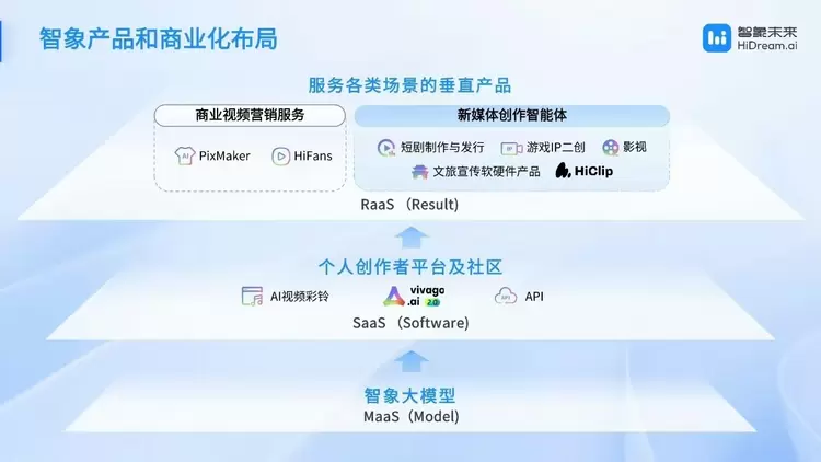 智象未来持续致力于从技术到价值的产品化思路,在这一过程中,智象构建了“MaaS-SaaS-RaaS”的递进商业化体系