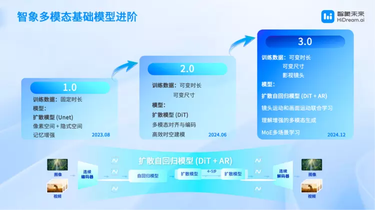 技术层面,智象多模态基础模型历经三次重要迭代,构建起 “理解深、控制准、画质高” 的核心优势。模型从 2023 年 8 月的 1.0 版本(扩散模型 DiT,实现多模态对齐),到 2024 年 6 月 2.0 版本(扩散自回归模型 DiT+AR,强化时空建模),再到 2024 年 12 月 3.0 版本(MoE 多场景学习,记忆增强),持续突破生成技术瓶颈。