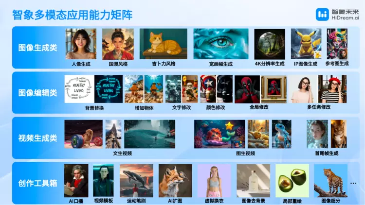 这种 “模型支撑服务,服务落地场景” 的逻辑,已在实际应用中验证:智象多模态生成平台已服务于影视制作、产品营销、文旅互娱等领域,实现从技术研发到商业价值的闭环。