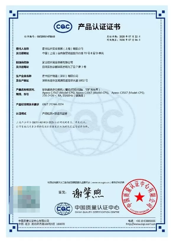 近日,富士胶片商业创新旗舰智能型A3彩色数码多功能机Apeos C3567/C3067/C2567获中国质量认证中心(CQC)颁发的"办公设备网络安全认证",系列产品是首批达到新版国家标准GB/T 29244-2024《网络安全技术 办公设备安全规范》(增强级)的产品之一。作为首批获该认证的企业,富士胶片商业创新(中国)有限公司在积极推进全行业加速数字化转型的同时,通过提供具有全方位安全防护的智能型数码多功能设备和网络安全网格解决方案与服务为企业构筑全面的信息安全防护。
