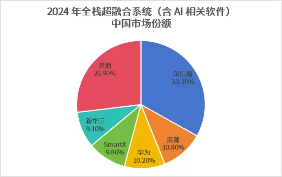 值得注意的是,在超融合市场发展趋势方面,报告指出人工智能场景的落地正在推动全栈超融合的增长,2024 年中国含 AI 相关软件的全栈超融合系统市场份额如下图所示。IDC 预测,生成式人工智能(GenAI)将在未来 18 个月内成为基础设施投资的首要驱动力。