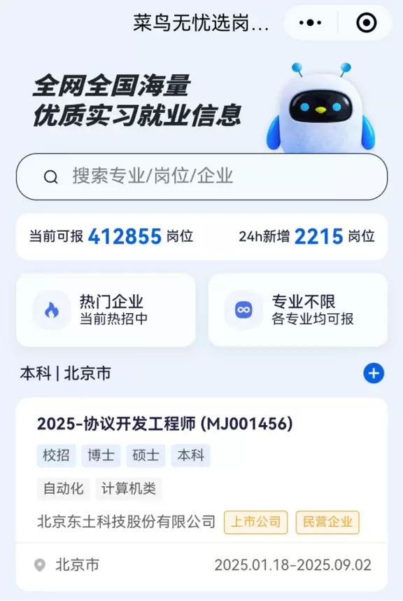 从技术打破信息差,到专业解决落地难,菜鸟无忧的 “科技 + 专业” 双轮驱动,正在重新定义就业服务的标准:不止于 “找到工作”,更要 “找到对的工作”;不止于 “顺利入职”,更要 “实现长期职业成长”。这正是 AI 时代就业服务的真正价值 ——科技赋能就业,让OFFER触手可及!