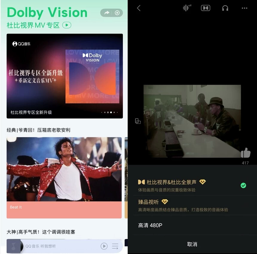 杜比视界是杜比实验室推出的一项革命性的影像科技。杜比视界将HDR(高动态范围)与广色域相结合,带来始终忠于创作者意图的超凡生动的画面。与普通画面相比,杜比视界可带来以前在屏幕上从未出现过的色彩,呈现更耀眼的亮部和更深邃的暗部,精致鲜活的画面会让人忘记自己是在观看屏幕上的影像。在QQ音乐全新升级的杜比专区,精选杜比视界MV内容上线,用户可欣赏到令人惊艳的亮度、无与伦比的对比度和引人入胜的色彩,获得栩栩如生的娱乐体验。
