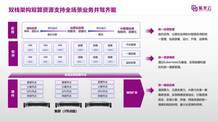 2024年,紫鸾云原生超融合一体机凭借全栈超融合架构,成功解决了业务云原生转型的“最后一公里”难题。2025年,紫鸾应用容器智算版再次升级,融合独特双栈与AI能力,实现全栈超融合的再一次升级,为客户提供简单、高效、可靠且灵活扩展的云数据中心解决方案。