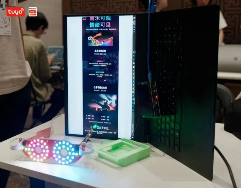 这是一款创新性的情绪可视化AI眼镜,专为增强情感传递效率的社交场景设计。青年开发者们基于涂鸦T5开发板,进行代码编写和嵌入式软硬件开发,实现了传感器数据的快速处理和复杂灯光效果的精准驱动。