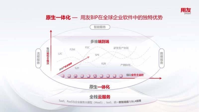 用友 BIP 作为新一代企业软件的代表,以原生一体化为核心优势,实现了 10 大应用领域的拉通,流程服务、数据服务、智能服务的深度融合,以及平台、模型、领域应用与 ISV 生态产品的无缝对接。用友 BIP 覆盖了10个业务与管理领域,从企业的研发、采购、制造、销售、供应链、项目、 资产到财务、人力、协同办公,是目前全球覆盖领域最宽的企业软件。其原生一体化特性有效消除了信息化时代的 “应用烟囱”“数据孤岛” 以及智能化阶段的 “智能碎片”问题。同时,用友BIP穿越了企业成长的全生命周期,无论是成长型企业还是大型企业,对新一代数智化系统的升级需求,用友 BIP 都能凭借自身优势满足企业复杂的业务需求。