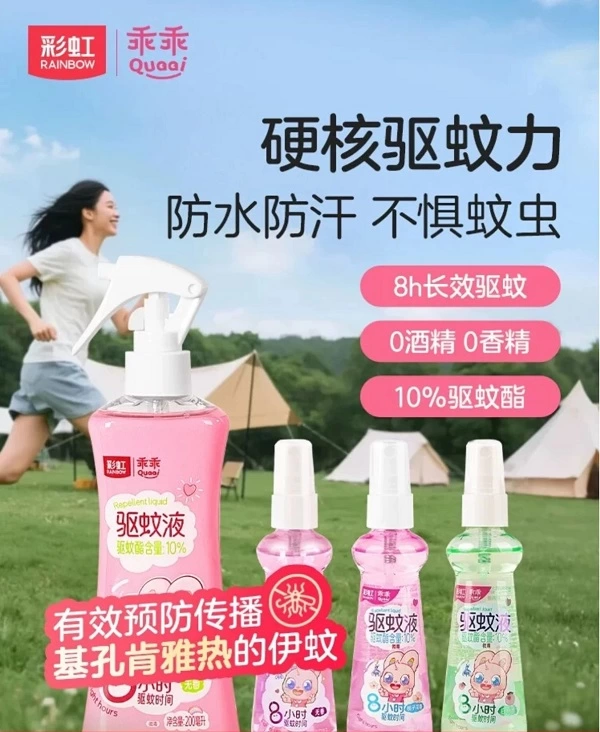 日常户外:步行时尽量避开路边草丛、树荫下等蚊虫聚集区,选择光线充足的路段。外出前在裸露的手臂、小腿等部位薄涂驱蚊液,快速形成防护层;或者也可以佩戴驱蚊手环,利用其持续散发的气味驱赶身边蚊虫。像是彩虹集团旗下的乖乖驱蚊液它含10%驱蚊酯,还不添加香精和酒精、只要往皮肤上喷一喷就可以清爽防蚊8小时。