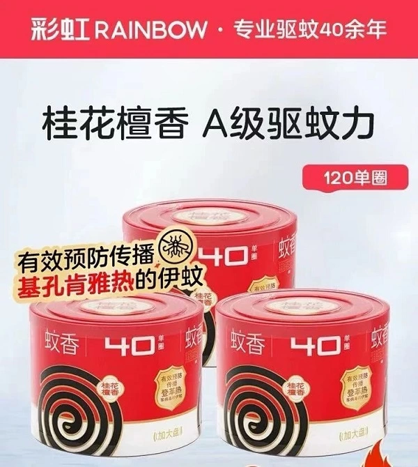 居家防蚊:每当夜晚,气温下降后是蚊子出没的好时机,想要有一个安稳的睡眠也需做好防蚊措施。首先,可以在房间的窗户、沙发、床铺等地方喷洒防蚊液驱赶蚊虫。另外,睡觉前可开启点燃电蚊香或盘香,关上门窗密闭片刻增强效果。如果您比较习惯用盘香的话,彩虹新出的桂花檀香型盘香就很适合,不仅味道好闻,对有效预防传播基孔肯雅热的伊蚊也很有作用。不过,由于盘香是明火点燃型的蚊香,在使用时还需特别注意用火安全,请尽量远离床头、沙发等易燃物品放置。