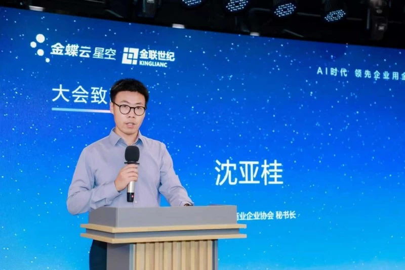 中国中小商业企业协会秘书长沈亚桂先生在致辞中强调,AI不仅是工具,更是重构业财战略的契机。他指出,企业需要打破业财分离思维,将AI深度融入战略规划与流程重构。通过智能预测优化决策,推动业财管理从"经验驱动"转向"数据驱动"。同时,他呼吁金蝶等服务商提供轻量化解决方案,并建议联合搭建AI技术共享平台,为企业提供全链条业财支持。