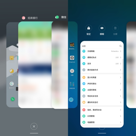 Flyme还对另一高频率使用却极易泄露隐私的场景“后台多任务”进行了针对性处理。当Flyme识别到用户开启了金融类APP时,系统会自动对其多任务卡片进行模糊处理,保护用户隐私安全。