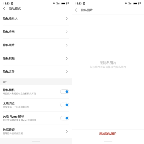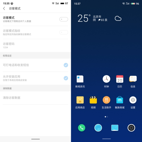 Flyme隐私模式和访客模式则可以既保护你的隐私,又不会让场面尴尬。在隐私模式下,你可以把一些不想被他人看见的内容,包括联系人、应用、照片和视频等等信息事先进行隐藏,只有通过输入你设定的独立密码后才能查看,确保你的隐私万无一失。