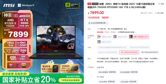 每年暑促都是玩家购机的好机会:微星神影16 锐龙版 2025在AMD锐龙9 7945HX+RTX5070配置组合首发后,再次向市场投放“重磅炸弹”:7945HX+RTX5060全新配置只需7899元,国补20%优惠后,到手价更是来到6319.2元。作为一款游戏性能、生产力属性都拉满的实力电竞游戏本,推荐给所有学生朋友们选购,如此价位可以获得越级般体验!