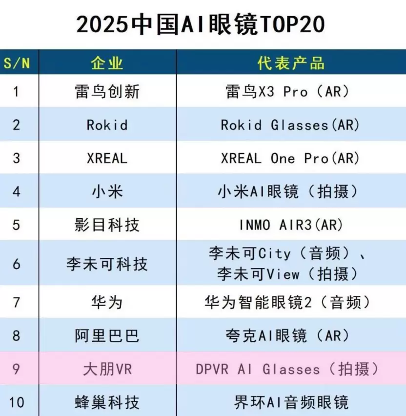 更值得一提的是,随数据发布的 “2025 中国 AI 眼镜 TOP20” 榜单中,DPVR(大朋 VR)凭其在智能穿戴与视觉交互领域的多年积淀与匠心研发的 DPVR AI Glasses 上榜。