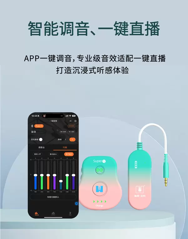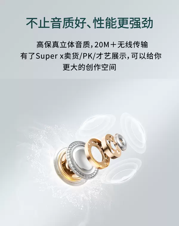 内置专业级音频处理芯片,高保真立体声精准还原人声细节。20M+范围内无线传输稳定流畅,无论是在大型舞台演出,还是宽敞的直播间环境中,都能实现声音零延迟传输。