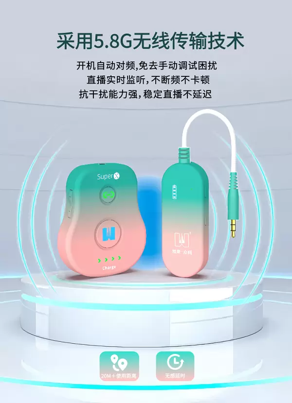 采用先进的5.8G无线数字传输技术,开机后自动快速对频,省去繁琐的手动调试步骤。抗干扰能力超强,直播时实时监听不卡顿、不断频,声音输出清晰精准。