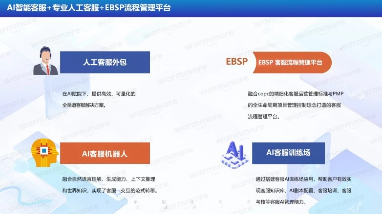 这一模式的落地,依托于网萌科技构建的智能客服生态体系——涵盖人工客服外包(客服BPO)、EBSP客服流程管理平台、AI 客服及AI训练场四大核心模块。