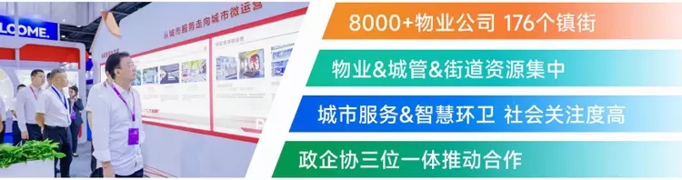 物业品牌展区:物业公司、房地产企业、各省市物业协会展团、新锐品牌物企等城市服务展区:镇街全域服务治理、城市综合整治、文旅资源管理、智慧路灯、智慧政务、新基建等环卫设备展区:路面清扫、冲洗设备与车辆、洒水车、除尘降霾雾炮车、市政排水车、垃圾装卸设备、环卫专用机械等智慧科技展区:物联网、智慧城市、智慧社区、智能停车、智能楼宇、智能安防、智能家居、系统管理平台等机器人展区:消杀、清洁、安防、巡逻、护理、导引等物业服务型机器人产品清洁绿化园林:清洁绿化设备、环境卫生、社区服务设施、废弃物管理、供水与污水处理以旧换新展区:电梯加装、照明灯具、家电厨卫、家居适老化改造、老旧小区改造等停车充电展区:社区停车、充电桩、新能源充电等设备社区多种经营:自助服务设备、拎包入住、社区教育、社区直播物业养老展区:社区养老服务、居家养老设施设备物业制服展区:人员职业西装、工作人员制服、保安职业制服人才、法律展区:物业人才培训、教育、资格证、法律服务等全国100多家物协联动举办 推动行业采购选品