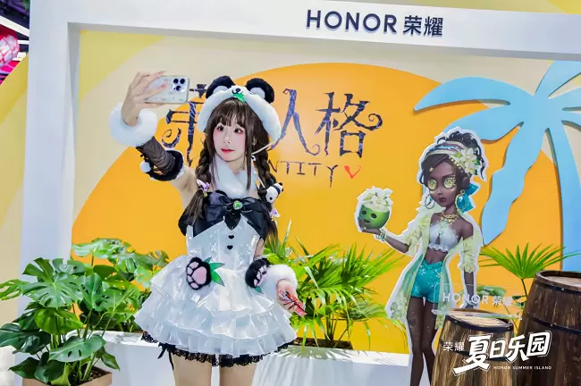 以「荣耀夏日乐园」为主题,荣耀设置了「荣耀游戏中心」「酷夏极能体验站」「夏日自拍馆」等多个区域。不仅合作了《第五人格》《永劫无间》两大热门游戏IP,打造了富含游戏特色的互动环节,还有真人Coser盲盒活动以及海量周边礼品相送,为玩家们带来了众多惊喜体验。